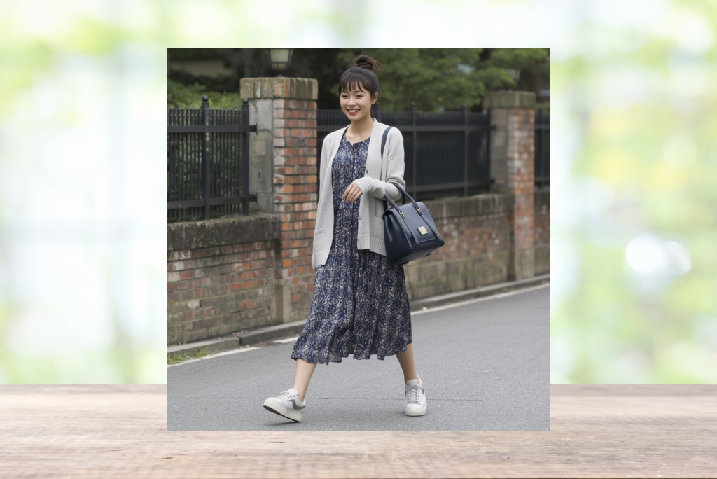 選んだのは、シンプルなワンピース+白スニーカー+軽めの羽織り。